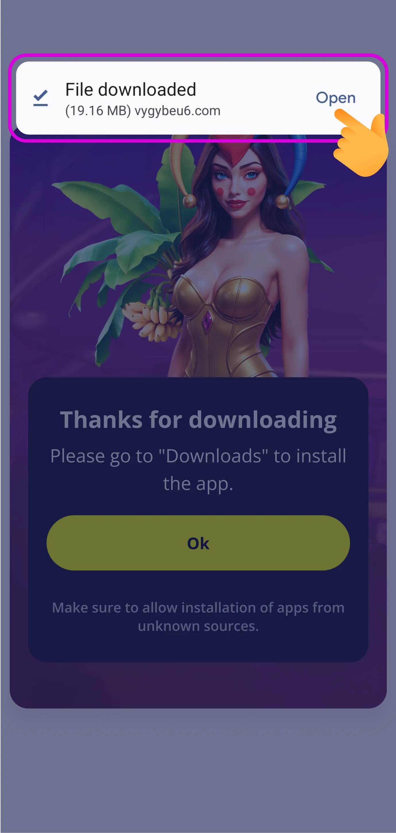 - Изтеглете APK файла на казиното, като натиснете на линка точно под него и след като това е завършено, натиснете на самия файл.